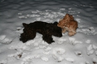 This morning when hubby woke up to see if he had to go to work he woke me up to tell me there were a couple inches so I got up, got dressed, and took the dogs out for their first time in the snow ever. Then crawled back under the covers for another hour and a half of sleep.